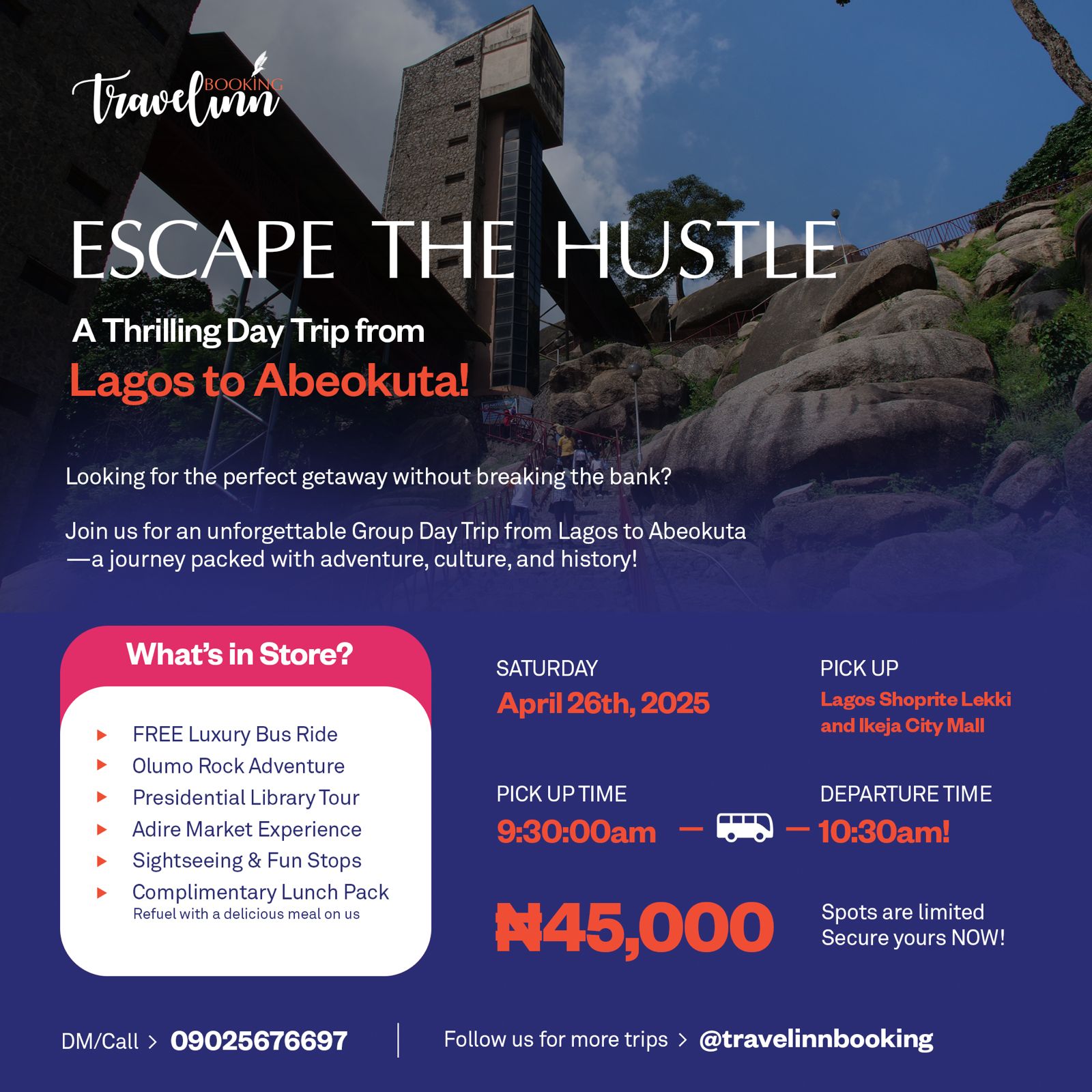 Networking EventJoin us for an exciting day trip from Lagos to Abeokuta! Explore the rich history and culture of Abeokuta while enjoying a fun-filled day with fellow travelers. Don't miss out on this opportunity to visit iconic landmarks like Olumo Rock, Olusegun Obasanjo Library, Adire Market, taste delicious local cuisine, and create unforgettable memories. Whether you're a history buff or just looking for a unique adventure, this day trip is perfect for you. Get ready for an unforgettable experience!